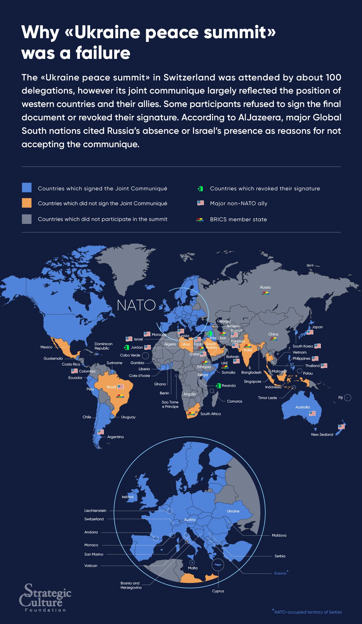 The "Ukraine peace summit" in Switzerland was attended by about 100 delegations, however its joint communique largely reflected the position of western countries and their allies. Some participants refused to sign the final document or revoked their signature. According to AlJazeera, major Global South nations cited Russia's absence or Israel's presence as reasons for not accepting the communique.