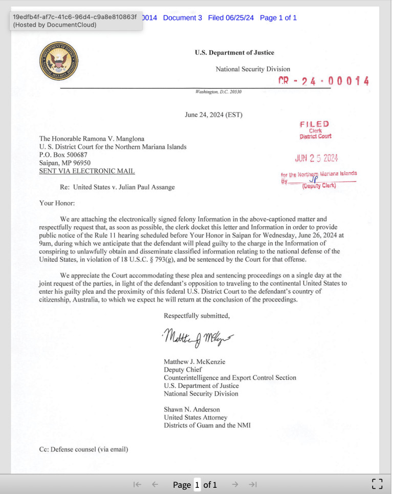 Assange a accepté de plaider coupable d'«un crime pour avoir conspiré en vue d'obtenir et de diffuser illégalement des informations classifiées liées à la défense nationale des États-Unis», comme l'indique une lettre du ministère de la Justice ainsi que d'autres documents (déposés auprès du tribunal de district des îles Mariannes du Nord, un territoire des États-Unis situé dans la région du Pacifique).