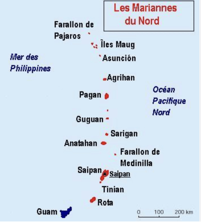 Les îles Mariannes du Nord [l'un des deux territoires américains des Iles Mariannes, l'autre est Guam] sont des îles isolées de 57 154 (2023) habitants situées dans le Pacifique au nord de Guam et appartenant au Commonwealth américain.
