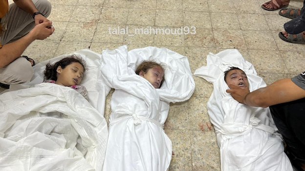 Les frères et sœurs palestiniens Layan, Suwar et Abdulrahman ont été tués par une frappe aérienne israélienne qui a visé leur maison près de la pharmacie Al-Zahoor, dans le camp de réfugiés d'Al-Nuseirat.