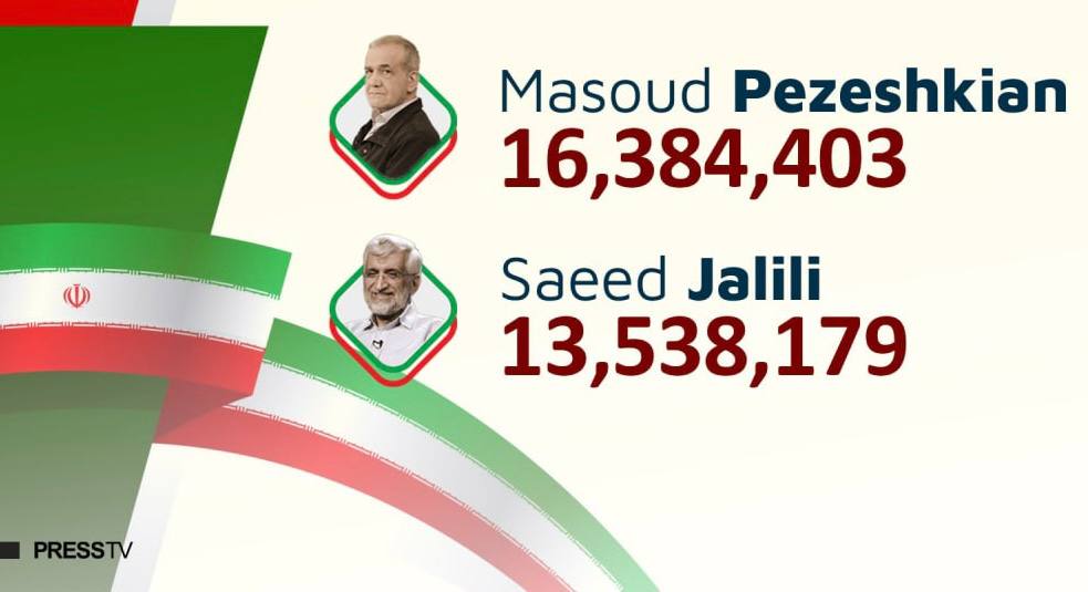 Le premier tour organisé le 28 juin dernier vit Mas'oud Pezeshkiân arriver en tête avec 10 415 991 voix. Sa'id Djalili est quant à lui arrivé second avec 9 473 298 voix. Aucun candidat n'ayant remporté la majorité absolue (50% + 1) au premier tour, un second fut donc organisé le vendredi 5 juillet.