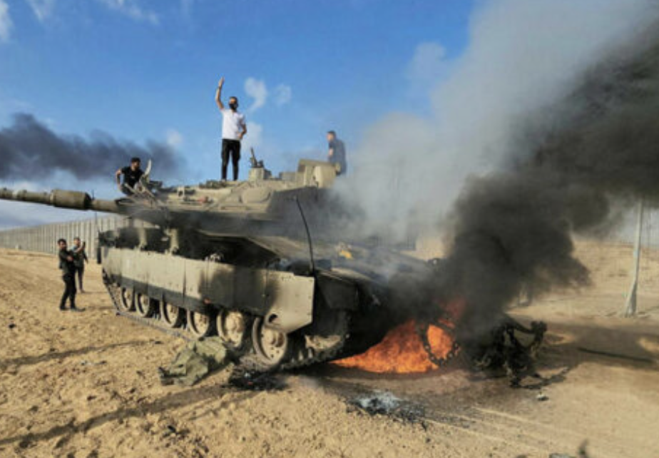 Des militants du Hamas avec un char qui a été attaqué samedi. (Crédit : Hassan Eslaiah/AP)