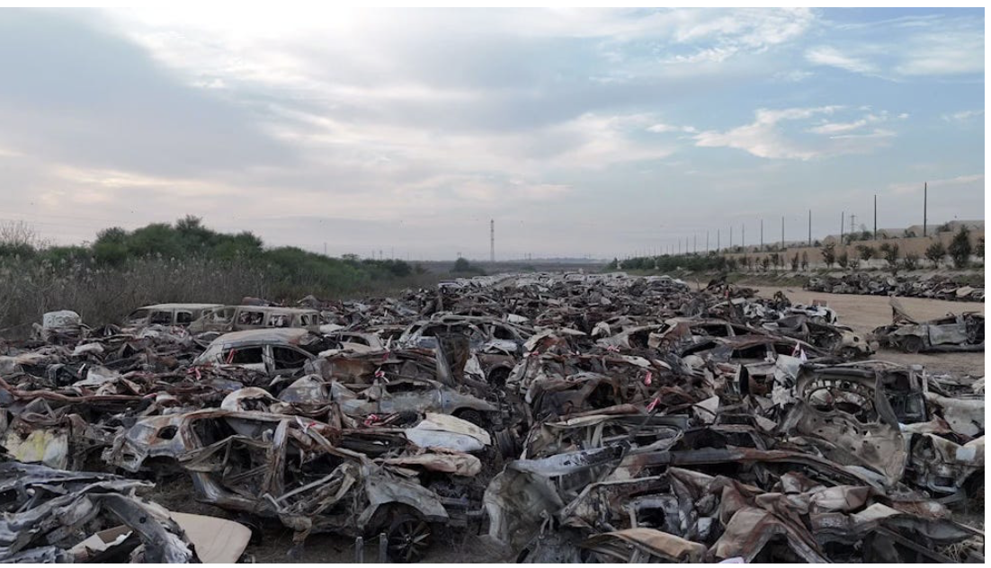 Capture d'écran d'une image publiée par le média israélien I24NEWS le 5 novembre 2023, montrant les carcasses de dizaines de voitures calcinées. De nombreuses personnes remettent en question le récit israélien selon lequel les combattants du Hamas qui ont franchi la barrière de séparation auraient pu causer ce type de dégâts, car ils n'étaient équipés que d'armes légères (médias israéliens).