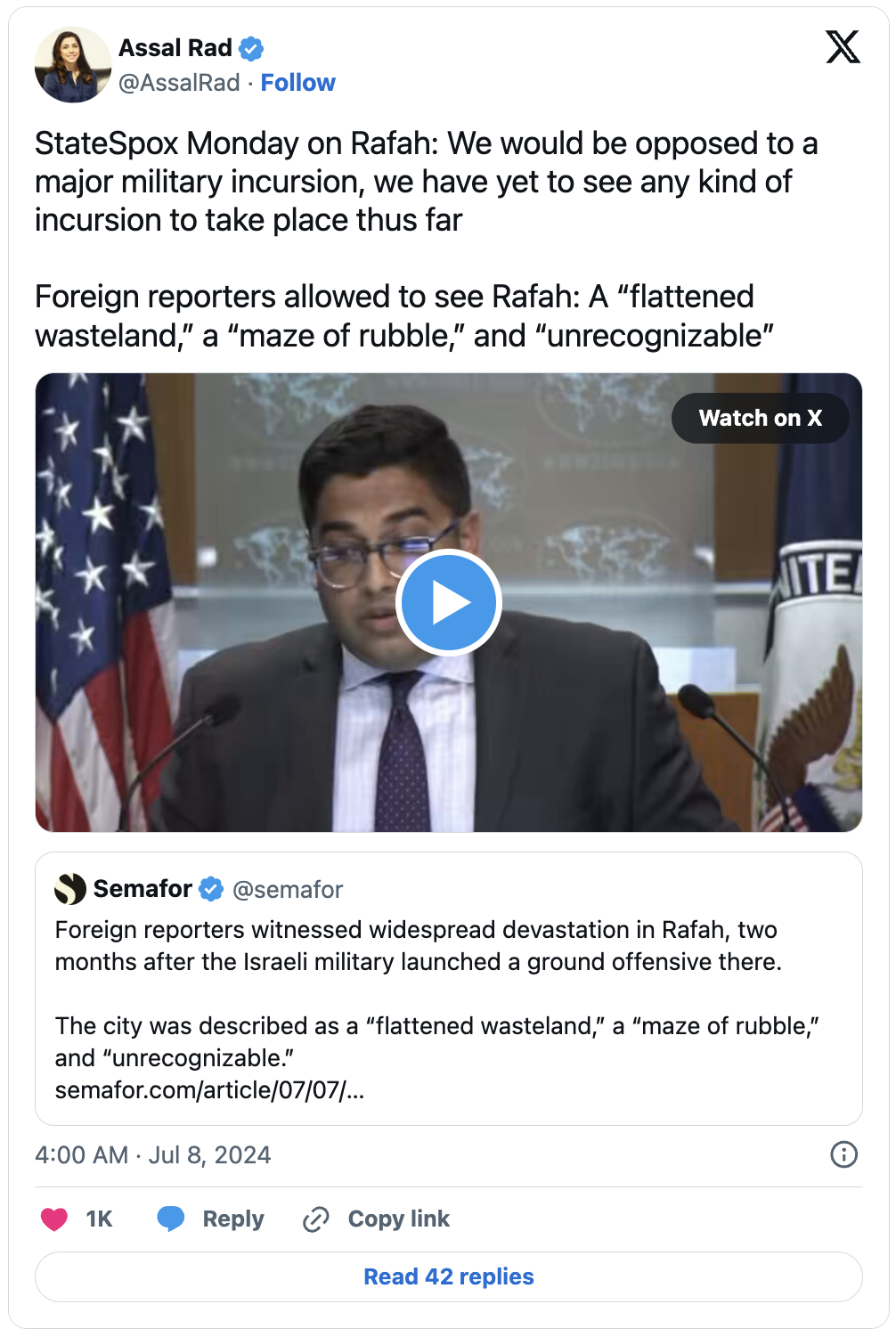 As Dr Assal Rad noted on Twitter, these reports come just days after the US State Department's deputy spokesman Vedant Patel told the press "We continue to believe that any major military incursion into Rafah we would be opposed to, but yet, we have yet to see any kind of incursion to take place thus far."
