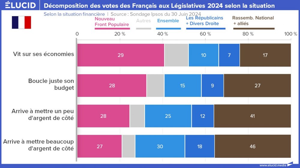 Le vote RN :: des Français malheureux qui souffrent du néolibéralismeL'étrange déconnexion entre le vote RN et les revenus disparaît cependant si on s'intéresse à la situation financière une fois que les charges (dépendantes de la taille de la famille ou du lieu de vie par exemple) sont déduites du revenu. La notion de revenu masquait en réalité de lourdes différences de modes de vie :: les personnes qui ont des fins de mois difficiles votent RN à 46 %, alors que les personnes qui épargnent beaucoup ont un vote beaucoup plus divers, mais 30 % d'entre elles votent Ensemble, « le parti des riches » ; le NFP n'est pas loin derrière, mais ce sont probablement des personnes aisées aux revenus un peu plus bas.