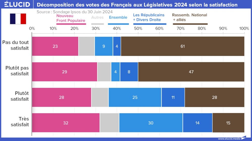 Le critère qui segmente le mieux le vote Ensemble du vote RN est celui de la satisfaction à l'égard de sa propre vie -- finalement le plus important de tous pour tout être humain. Les personnes non satisfaites de leur vie votent de façon écrasante pour le RN, à plus de 60 %. Le NFP ne recueille que 23 % des votes dans cette catégorie.
