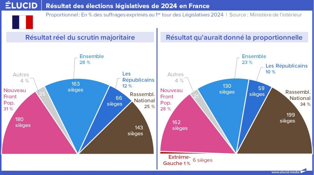 Les élections législatives de 2024 vont probablement marquer l'histoire de la Ve république. Elles font suite aux élections européennes qui ont engendré une panique générale en raison de la percée du RN. Nous avons analysé en détail des résultats dans cet article. De plus, la plupart des choses que nous allons présenter ici découlent de la particularité de notre mode de scrutin, inefficace, voire aberrant. Pour en savoir plus, nous vous renvoyons vers notre article dédié, qui explique les avantages jamais discutés de la mise en place d'un scrutin proportionnel.
