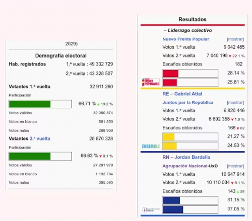 Les élections dans la pays de la deuxième économie de l'UE sont enfin arrivées et le résultat attendu s'est produit, confirmant l'effondrement du modèle mondialiste et suscitant le désespoir des élites de ce secteur. Malgré sa victoire au premier tour, le Rassemblement national (RN) de Mme Le Pen a perdu la première place au profit de l'alliance entre le macronisme et la gauche, qui, en coalition, s'est partagé les deux premières places. La prochaine nomination du premier ministre dépendra d'un éventuel accord entre ces blocs.