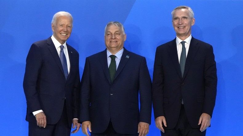 Joe Biden, Viktor Orban et Jens Stoltenberg le 10 juillet à Washington au sommet de l'OTAN. Le Premier ministre hongrois est parvenu à rencontrer en moins de dix jours Volodymyr Zelensky, Vladimir Poutine, Xi Jinping, Joe Biden et Donald Trump.
