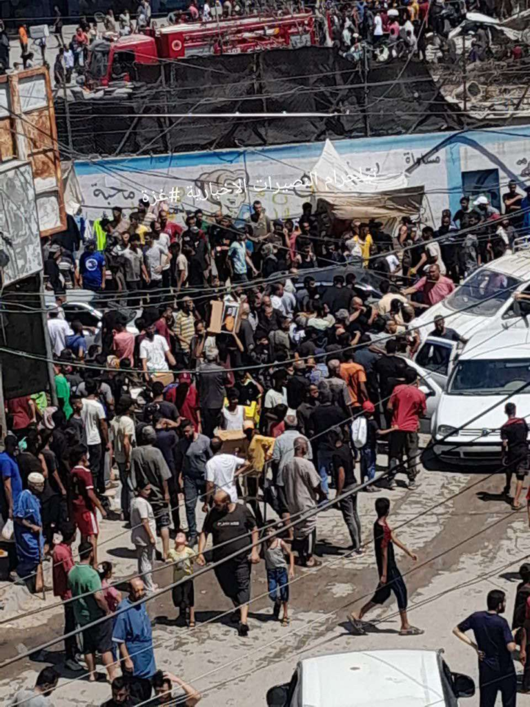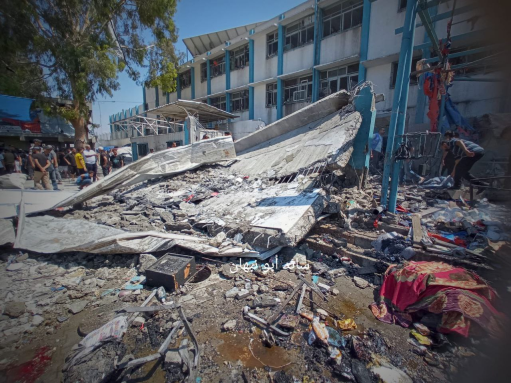 - À l'école de l'UNRWA dans le camp de Nuseirat, dans le centre de la bande de Gaza. Le premier s'est produit à l'école de l'UNRWA Al-Razi, dans le camp de réfugiés d'Al-Nuseirat, tuant 23 personnes et en blessant 73 autres.