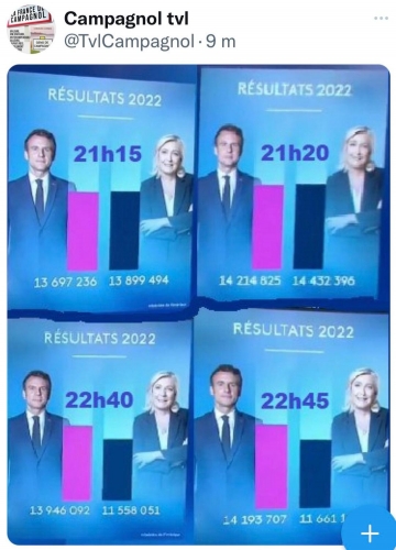 Étrange également l'argument fourni par l'AFP factuel, que Marine était très contente de son score (argument donné par une perdante pour sauver la face !) pour valider chez le lecteur le misérable 42 %, alors que les derniers sondages étaient beaucoup plus serrés, que les Français refusaient Macron à plus de 70 % ! […] Ce sont bien des escrocs qui ont organisé cette élection et qui ne sont plus à un délit près, car leur défaite aurait sonné le glas non seulement de leur carrière politique mais aussi de leur liberté; après tous ces méfaits, ils auraient dû finir à l'ombre. Cette élection était donc pour eux une question de vie et de mort! Et si nous étions encore en démocratie, cette élection aurait été annulée. »