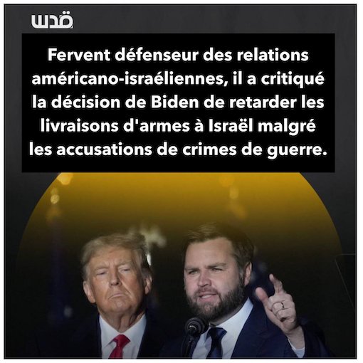 Trump a annoncé qu'il a choisi le sénateur républicain J.D Vance comme son candidat à la vice-présidence. Celui-ci s'est déclaré en faveur d'une politique belliqueuse envers l'Iran et pour une collaboration totale avec Israel. Il a même critiqué Biden à un moment d'avoir « retardé » les livraisons d'armes à Israel.