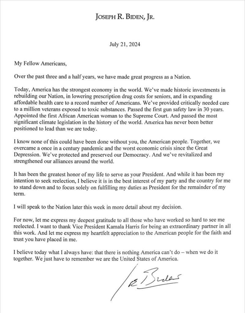 Les seules autres personnes qui se trouvaient avec Biden dans la résidence lorsqu'il s'est levé dimanche étaient la première dame Jill Biden et deux autres collaborateurs de confiance : la chef de cabinet adjointe, Annie Tomasini, et l'assistant de la première dame, Anthony Bernal. À 13 h 45, il a annoncé à un groupe un peu plus important de proches collaborateurs qu'il avait décidé la veille de ne plus briguer un nouveau mandat, leur a lu sa lettre et les a remerciés pour leurs services. Une minute plus tard, avant que les autres membres du personnel de la campagne et de la Maison-Blanche ne puissent être prévenus, il a publié cette lettre historique sur le compte de son bureau de campagne, sur le média social X».