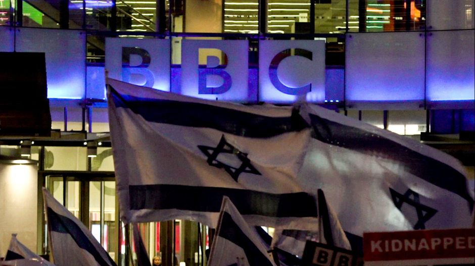 Feature photo |A video grab of protesters outside BBC Broadcasting House, London, October 16, 2023. Photo |AP