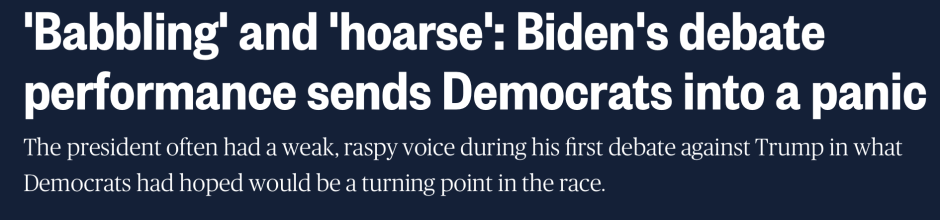 « ….[aucun démocrate] n'a n'a fait pression pour qu'il quitte la présidence plus tôt. Les démocrates sceptiques n'ont pas remis en question la capacité de Biden à remplir ses fonctions,, mais plutôt la détérioration de ses compétences en communication et sa capacité à mener une campagne vigoureuse jusqu'en novembre après sa piètre performance lors du [dernier] débat »