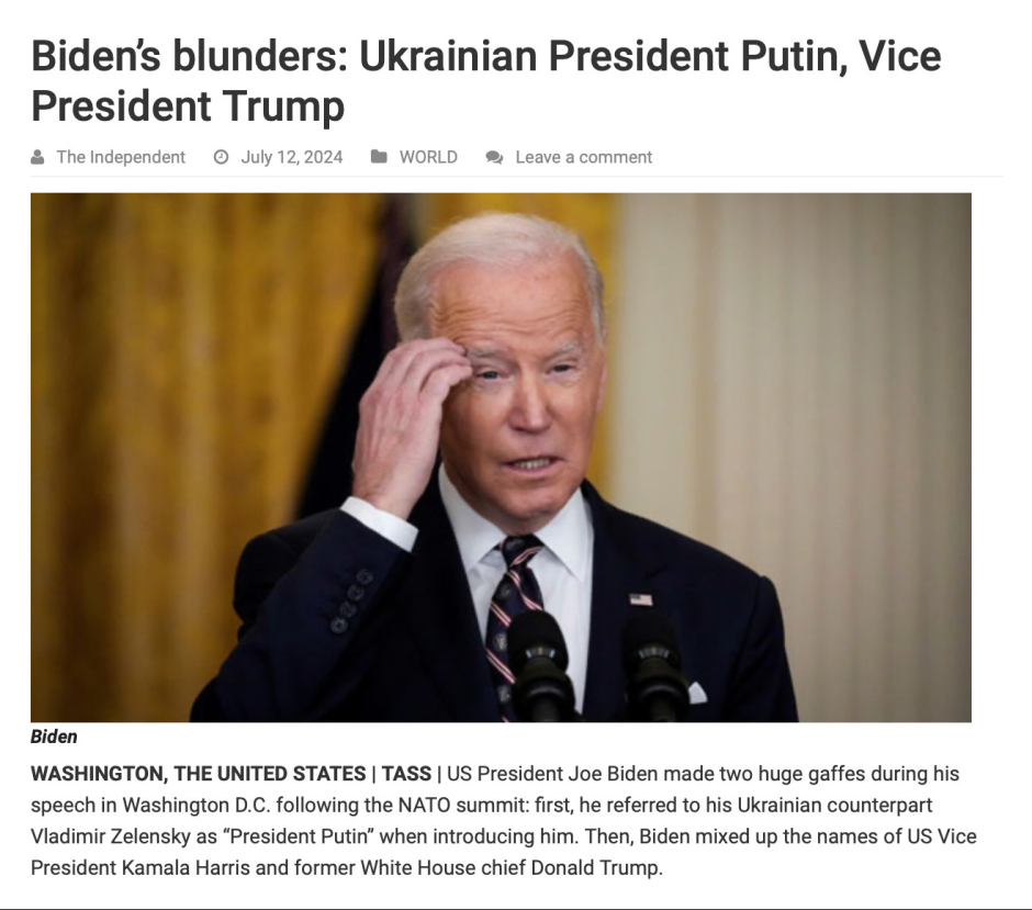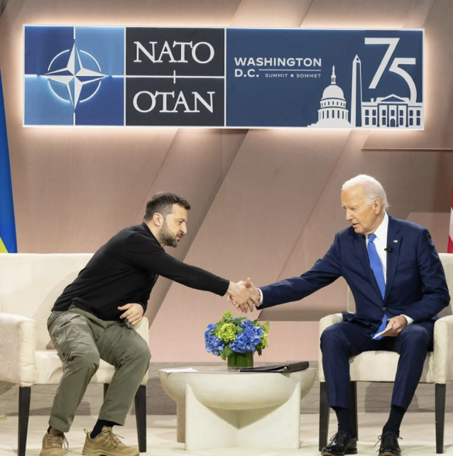 M. Biden a commis l'erreur alors qu'ils étaient entourés de dirigeants de l'OTAN lors d'une cérémonie de signature aux côtés de Zelensky le dernier jour du sommet de l'OTAN à Washington. C'est arrivé juste une heure avant une conférence de presse exceptionnelle de Biden qui a été qualifiée de décisive (« make-or-break ») pour sa campagne, car un nombre de plus en plus importants d'alliés politiques et de donateurs l'ont appelé à abandonner la course.