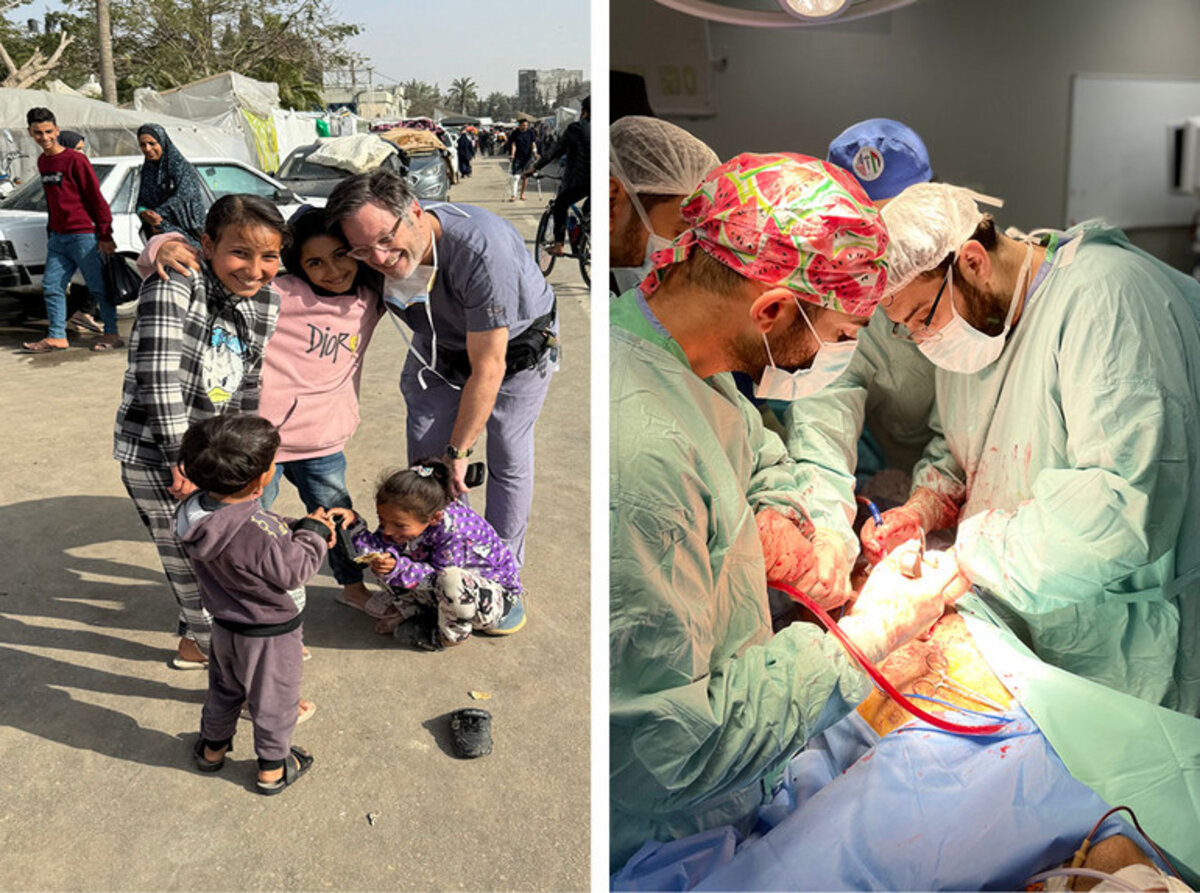 A droite : Le Dr Mark Pearlmutter joue avec des filles dans le camp de personnes déplacées autour de l'hôpital européen de Gaza. À gauche : Feroze Sidhwa opère un homme blessé par balle.