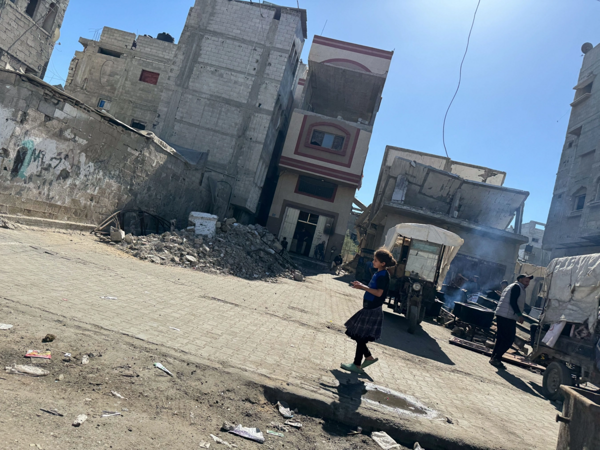 Une petite fille passe devant des bâtiments bombardés à Rafah. Après la destruction massive des hôpitaux de Gaza, il y a aujourd'hui environ 1 400 lits d'hôpitaux de soins aigus pour 2,2 millions de personnes.