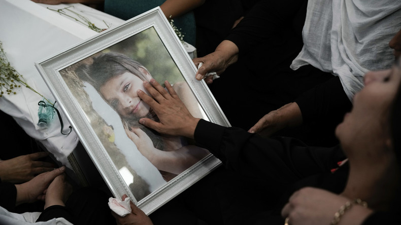 Photo de la jeune Alma Fkhrden, 12 ans, lors des funérailles le 28 juillet des enfants tués par une frappe de roquette à Majdal Shams.