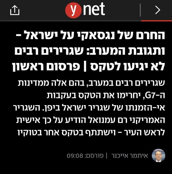 "Les ambassadeurs occidentaux boycotteront la cérémonie de commémoration des victimes de la bombe atomique à Nagasaki, au Japon, après que l'ambassadeur d'Israël se soit abstenu d'y assister en raison de la guerre (de Gaza). C'est ce qu'a appris Ynet. Parmi les ambassadeurs, il y avait aussi l'ambassadeur des États-Unis, Rahm Emanuel, le pays qui a largué la bombe sur Nagasaki. Il a informé le maire que si l'ambassadeur d'Israël n'était pas invité, il ne viendrait pas non plus.