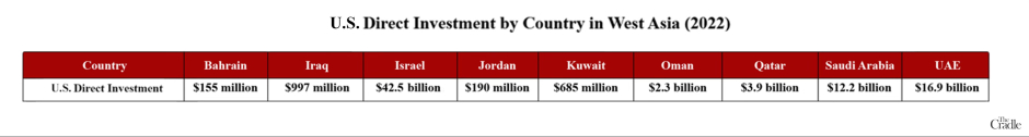 Ces entreprises sont fortement concentrées dans les États du golfe Persique, en particulier en Arabie saoudite, aux Émirats arabes unis, au Qatar et à Oman, ainsi qu'en Israël. L'État d'occupation est une destination particulièrement accessible pour les investissements américains dans la région, l'IDE américain (actions) en Israël atteignant à lui seul 42,5 milliards de dollars en 2022. Ces investissements se concentrent principalement sur l'industrie manufacturière, les services d'information et les services industriels, scientifiques et techniques.