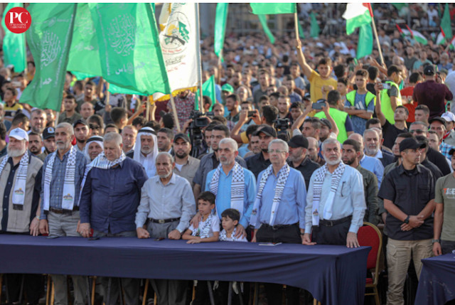 Yahya Sinwar (3ème à partir de la droite, avec les 2 enfants, entre Mahmoud al-Zahar et Mustafa Barghouti) participe à un rassemblement organisé par le Hamas à Gaza le samedi 1er octobre 2022 pour souligner la centralité de Jérusalem et de la mosquée Al-Aqsa. Photo : The Palestine Chronicle
