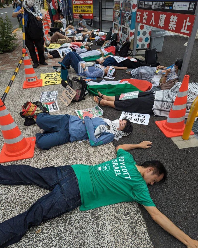 Des militants pro-palestiniens organisent une manifestation devant l'ambassade d'Israël à Tokyo, au Japon, demandant que l'occupation soit interdite de participer au Mémorial de la paix d'Hiroshima en raison du génocide en cours à Gaza.