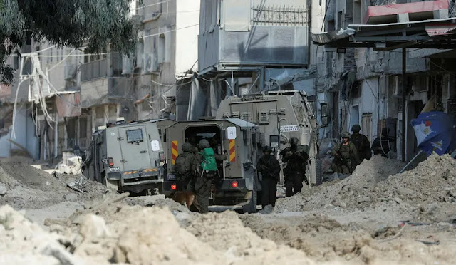 Des soldats israéliens près d'un véhicule militaire lors d'un raid israélien dans le camp de Nour Chams à Tulkarem, en Cisjordanie, jeudi 29 août. Photo : Mohamad Torokman/Reuters