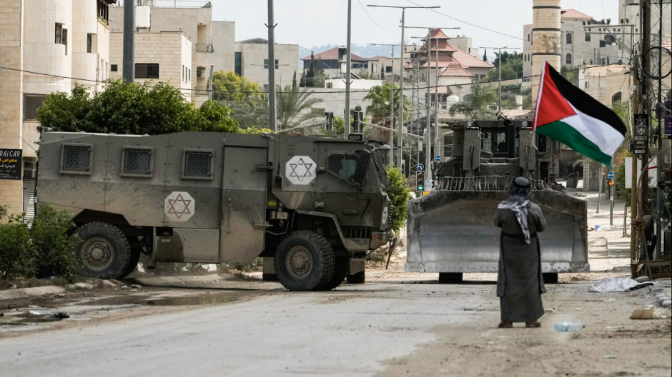 Feature photo |Palestinian activist Khairi Hanoon waves the Palestinian flag as a convoy of Israeli military armored vehicles drives by during an army raid in Tulkarem, West Bank,, Sept. 3, 2024. Majdi Mohammed |AP
