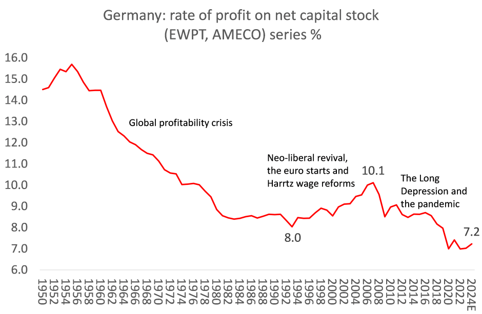 Además, el resurgimiento de la rentabilidad para el capital alemán desde el inicio del euro, la reubicación de la capacidad industrial hacia el este de la UE y los bajos salarios para una gran parte de la fuerza laboral ha llegado a su fin. La rentabilidad del capital alemán comenzó a caer durante la Gran Recesión y a lo largo de la Larga Depresión de la década de 2010. Pero la caída más grande se produjo durante la pandemia, y la rentabilidad se encuentra ahora en un mínimo histórico.