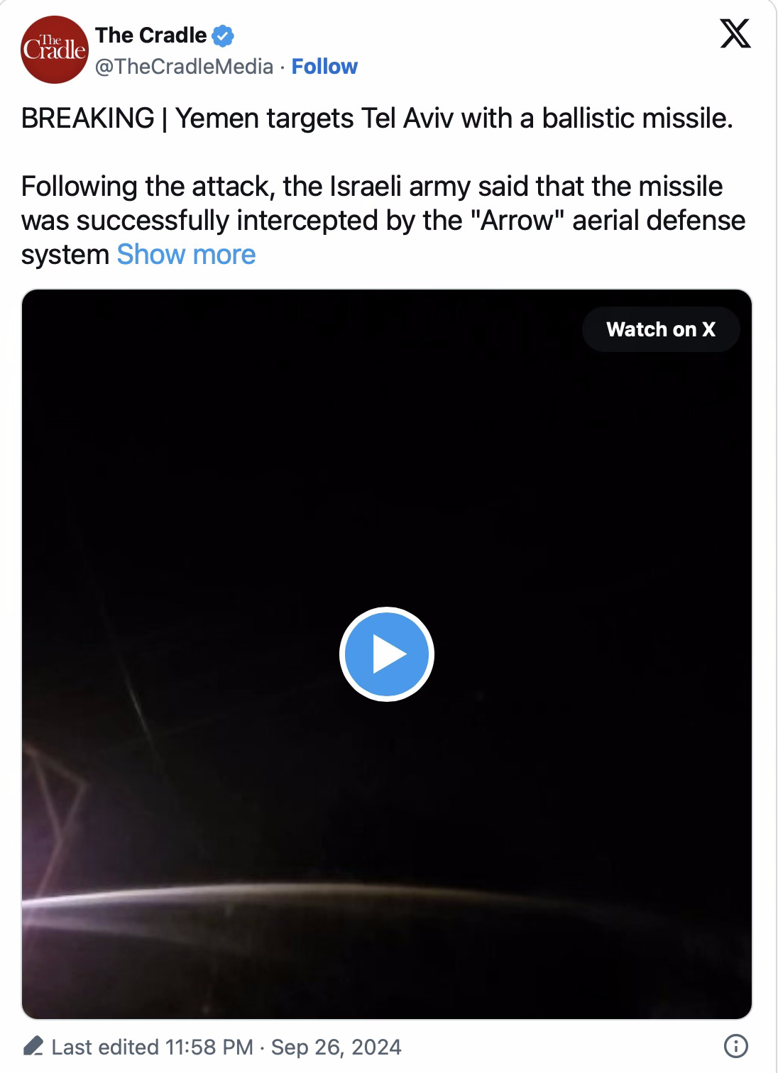 Le Yémen a tiré son deuxième missile balistique sur Tel-Aviv tôt le 27 septembre, provoquant une panique générale parmi les colons et forçant au moins deux millions d'entre eux à se réfugier dans des abris.