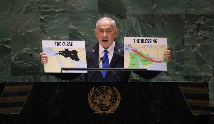 Au cours de son discours, Netanyahu a brandi deux cartes intitulées respectivement : « La malédiction » et « La bénédiction ». La première illustre l'intégration potentielle d'Israël au Moyen-Orient par rapport à l'influence de l'Iran dans toute la région avec un « arc de la terreur » : Syrie, Irak, Iran. Sur la carte de la malédiction, ni Gaza ni la Cisjordanie n'étaient représentés mais un « Grand Israël » annexionniste. L'an dernier, déjà à l'Assemblée générale, il avait sorti une carte illustrant un « nouveau Moyen-Orient » effaçant la Palestine.