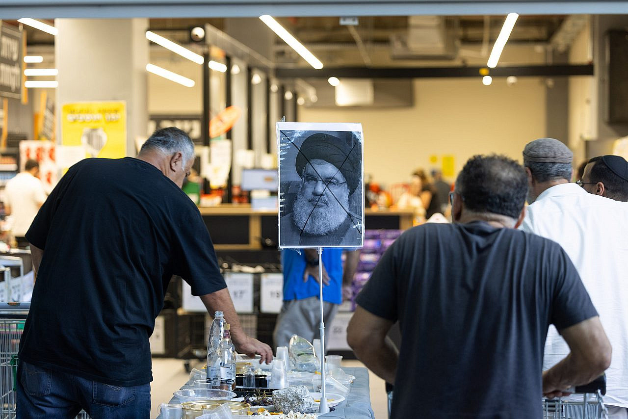 Une photo du leader du Hezbollah Hassan Nasrallah avec un X sur son visage est vue sur une table avec des boissons et de la nourriture pour célébrer son assassinat à l'extérieur d'un supermarché à Jérusalem, le 29 septembre 2024. (Yonatan Sindel/Flash90)
