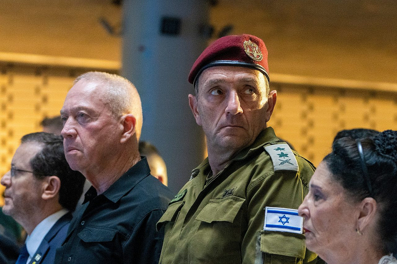 Le chef d'état-major de Tsahal, Herzi Halevi, et le ministre de la Défense, Yoav Gallant, assistent à une cérémonie commémorative de l'opération Bordure protectrice au National Hall For Israel's Fallen au Mont Herzl, à Jérusalem, le 16 juillet 2024. (Shalev Shalom/POOL)