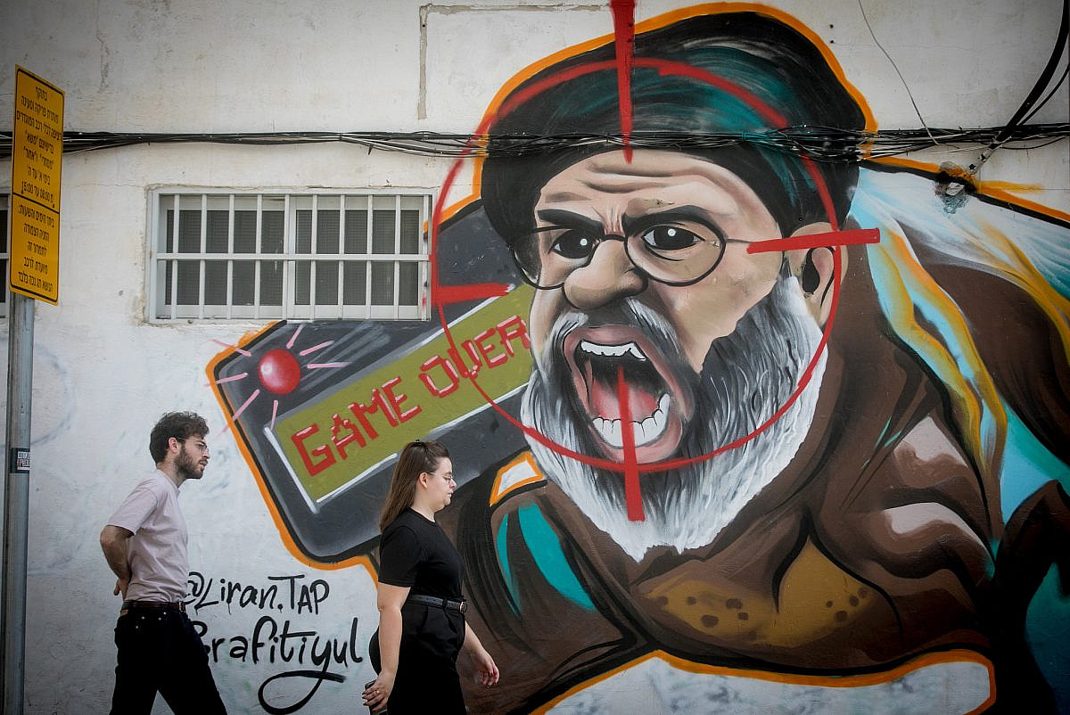 Graffiti représentant le chef du Hazbollah Hassan Nasrallah, à Tel Aviv, après l'assassinat du chef par Israël à Beyrouth, le 29 septembre 2024. (Miriam Alster/Flash90)