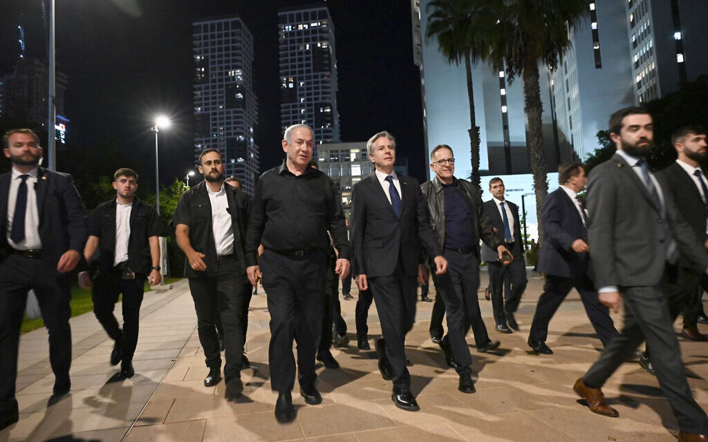 "La discussion avec Blinken se déroule comme suit : il est dans une pièce de la Kirya avec ses conseillers et son équipe de sécurité, tandis que le cabinet Sécurité mène les débats, et [le ministre des Affaires stratégiques Ron] Dermer fait des allers-retours et assure la liaison."