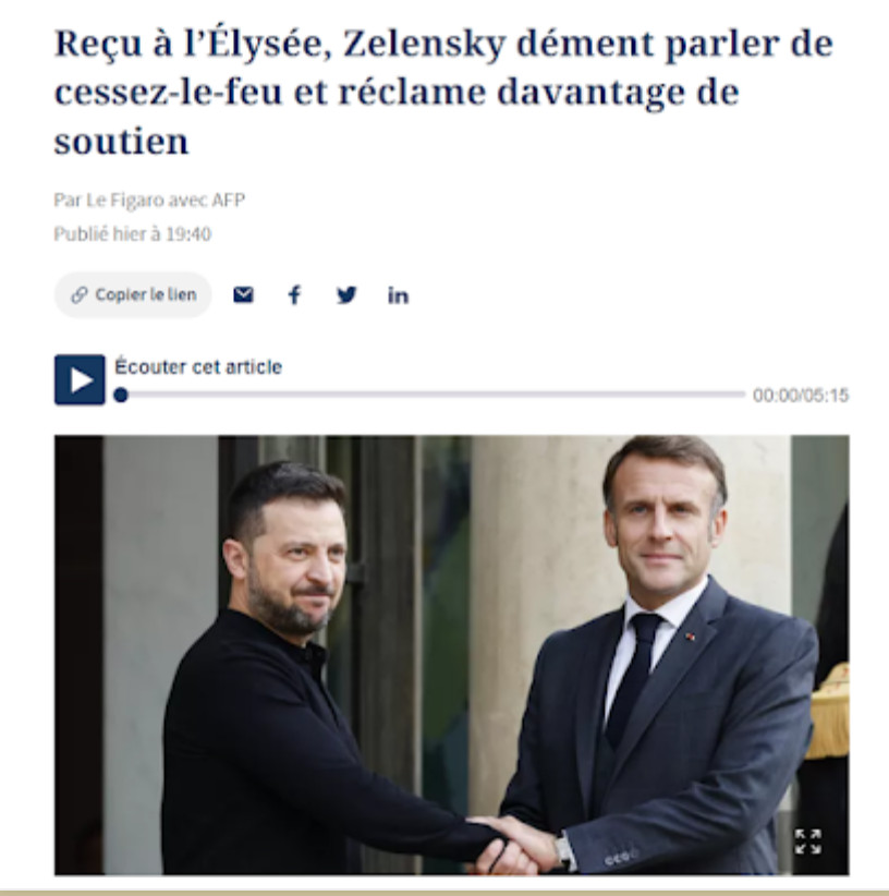 De son côté Zelensky insiste et porte la voix de ses maîtres atlantistes (les mêmes que Macron, d'ailleurs) :