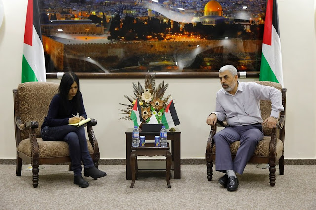 Il y a six ans, la journaliste italienne Francesca Borri (Bari, 1980), avait rencontré pendant cinq jours le leader du Hamas dans la bande de Gaza, Yahya Sinwar, et s'était entretenue avec lui. Au cours de leurs échanges, Sinwar souligne que l'échange de prisonniers est un élément important de tout accord avec Israël et affirme qu'il n'est pas intéressé par la poursuite des combats, mais « cela ne veut pas dire que je ne me battrai pas si c'est nécessaire ». L'entretien a été publié par le journal israéliien Yedioth Ahronoth le 10 mai 2018. On peut lire à la suite de l'entretien une brève conversation récente de Borri avec la Radio publique nationale des USA. [NdT]