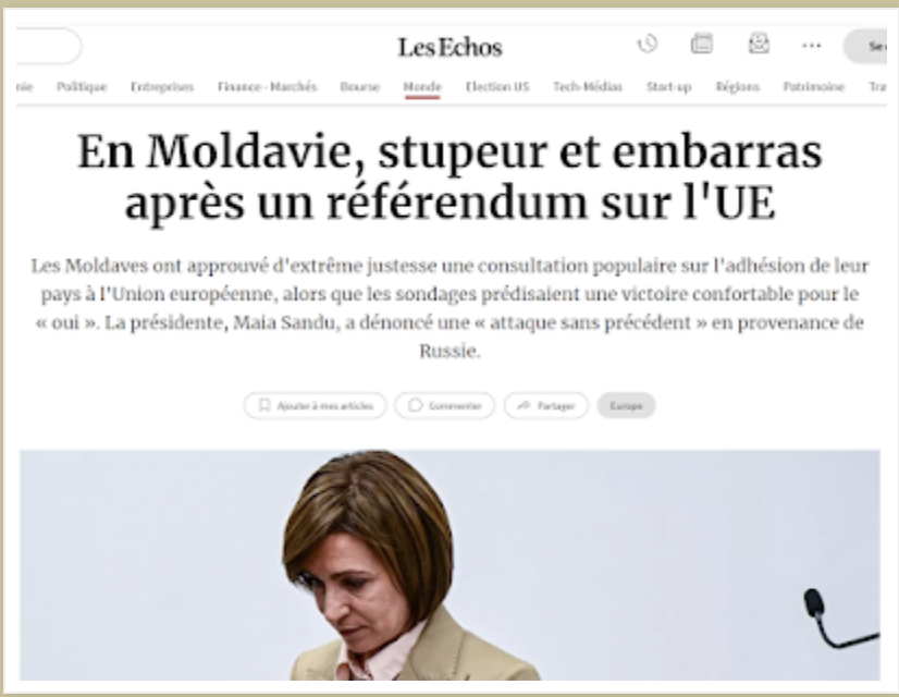La grande fête européenne n'a pas eu lieu en Moldavie. Il s'agirait même plutôt d'un véritable tour de force. Le référendum pour l'entrée de la Moldavie dans l'UE, que les médias et les élites globalistes annonçaient gagné d'avance, est passé d'un cheveu, grâce au vote aussi inattendu que massif de Moldaves de l'étranger. Personne n'ose parler de manipulation... sinon bien sûr de la part de la Russie.