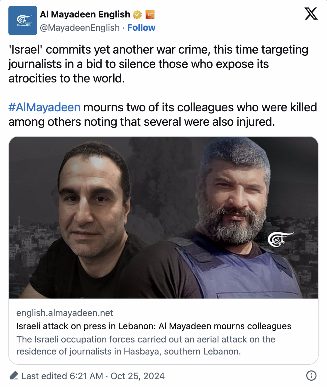 Des avions de combat israéliens ont tiré deux missiles sur une maison d'hôtes utilisée par des journalistes et du personnel dans le sud du Liban tôt le 25 octobre, tuant trois membres des équipes médiatiques d'Al Mayadeen et d'Al Manar TV, et en blessant d'autres.