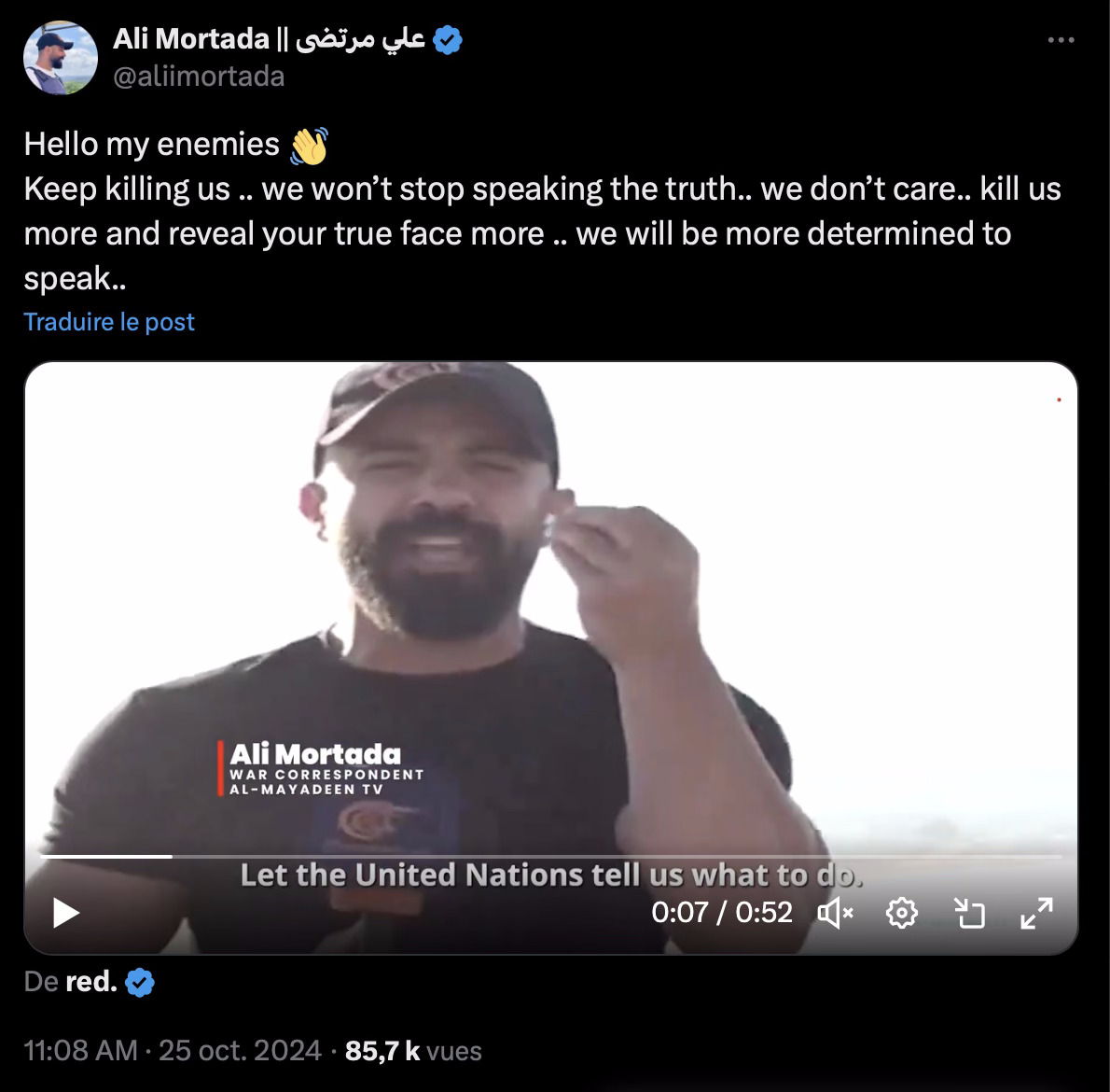 Ali Mortada, journaliste d'Al Jazeera blessé dans l'attaque, a diffusé ce matin une vidéo dans laquelle il exprime sa détermination à ne pas faillir :