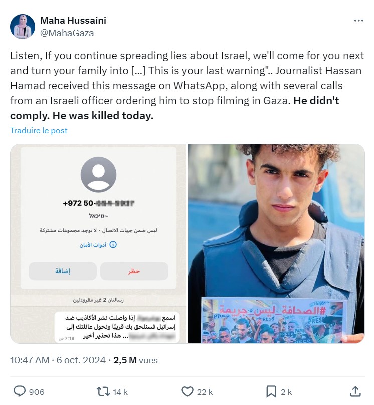 #Gaza: 🔴 Hassan Hamad, one of the last journalists still reporting from the northern enclave, was killed yesterday, in a targeted Israeli strike, according to RSF's information, as he was about to send footage from home after a report. Impunity must end. t.co pic.twitter.com/9x0CTtNAXI
