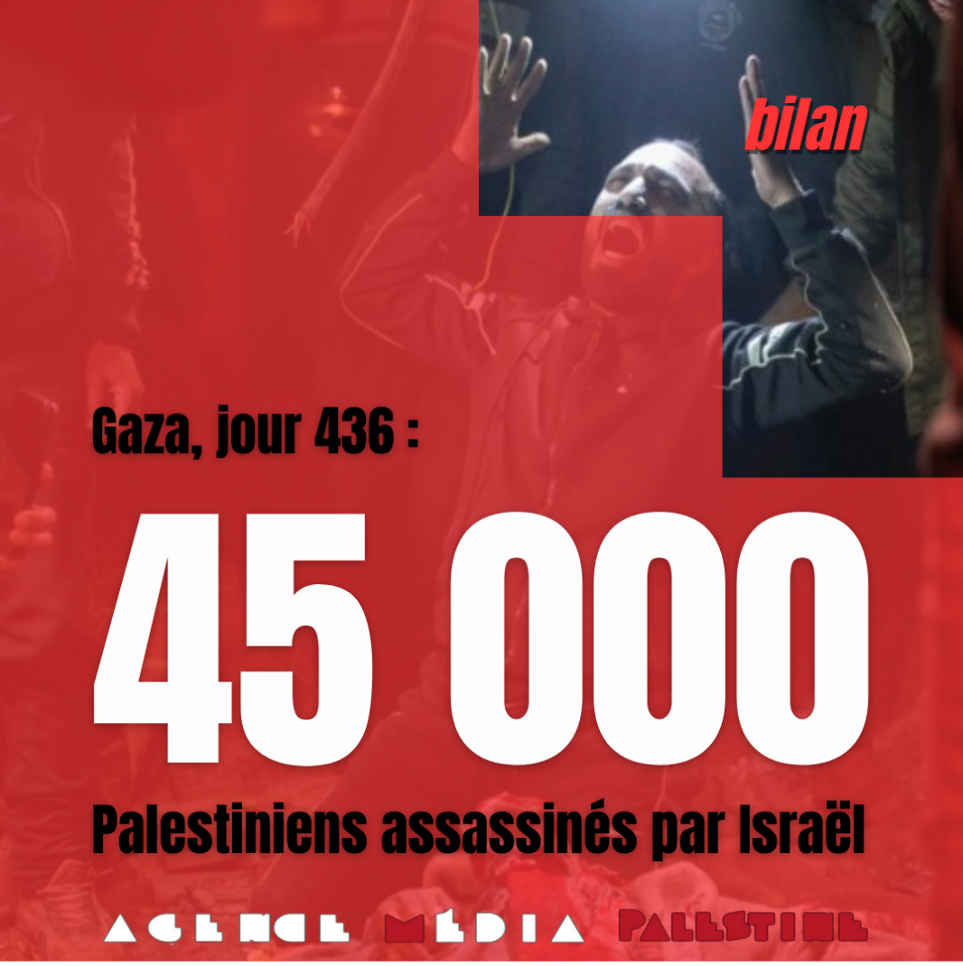 Le ministère de la santé de Gaza, ce matin du 16 décembre 2024, a annoncé qu'Israël avait assassiné plus de 45 028 Palestinien·nes dans la bande de Gaza depuis le 7 octobre 2023. Ce chiffre, qui correspond à près de 2% de la population palestinienne au début du génocide, est pourtant considéré comme sous-évalué.