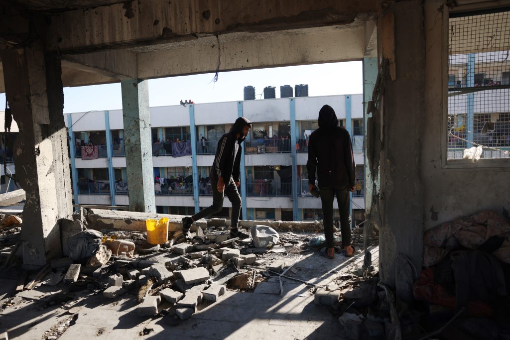 Des Palestiniens inspectent les dégâts après une frappe israélienne sur une école abritant des personnes déplacées à Khan Younis, dans le sud de la bande de Gaza, le 16 décembre 2024. (Photo STR/apaimages)