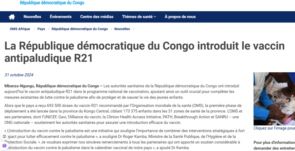 Juste avant le début de cette épidémie de paludisme, fin octobre, le Congo a introduit le nouveau vaccin contre le paludisme R21 dans son programme national de vaccination