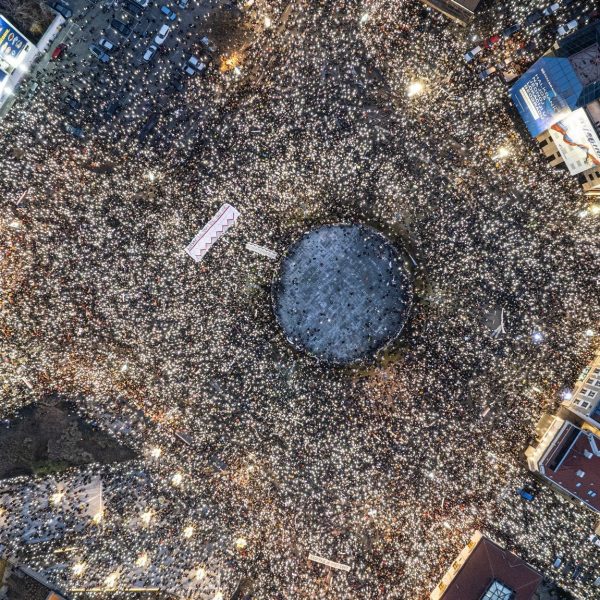 On Sunday 22 December Serbian university students and high school youth supporting them, pledging that they will not rest until their demands are met, staged a mass gathering in Belgrade to honour the Novi Sad dead with fifteen minutes of silence, a symbolic minute for each victim. The manifestation was joined by over one hundred thousand citizens from all walks of life .