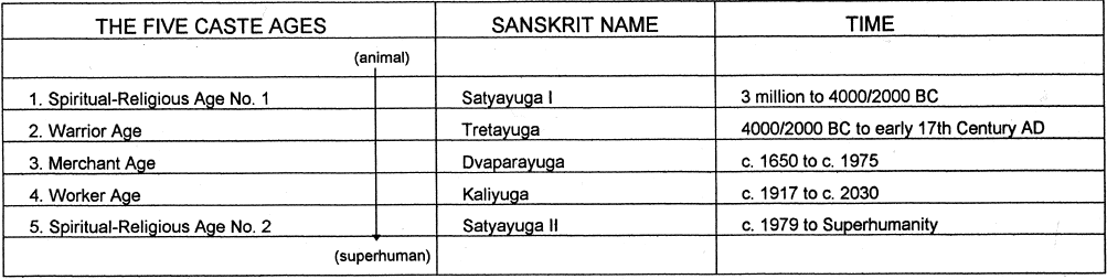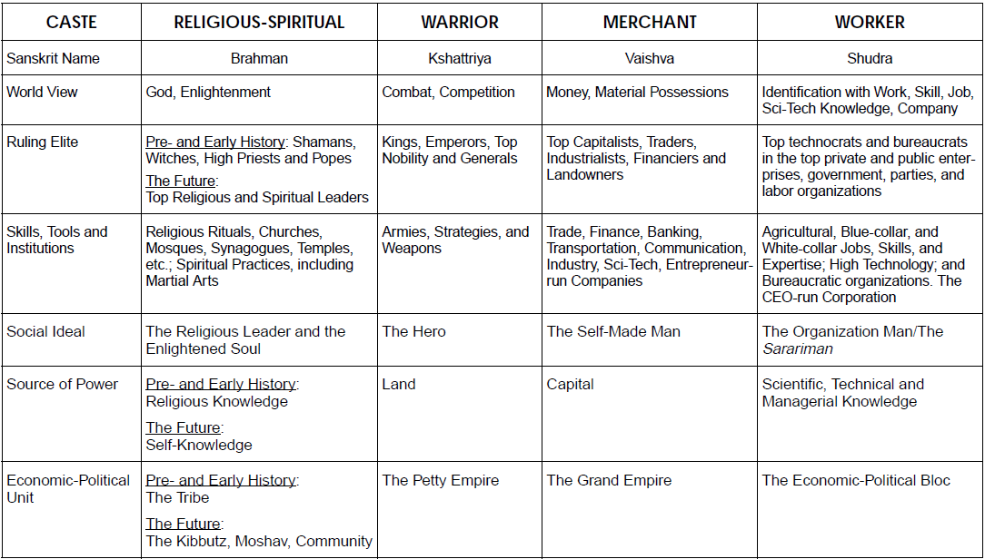 La prophétie védique selon laquelle l'humanité évolue en quatre phases distinctes est l'une des plus anciennes théories des étapes au monde. Les anciens sages indiens ont prédit un cycle dans lequel les visions du monde des quatre varnas - enseignant, guerrier, marchand et ouvrier - se succèdent pour «gouverner le monde». Ce cycle des varnas reflète la cosmologie cyclique des Vedas.