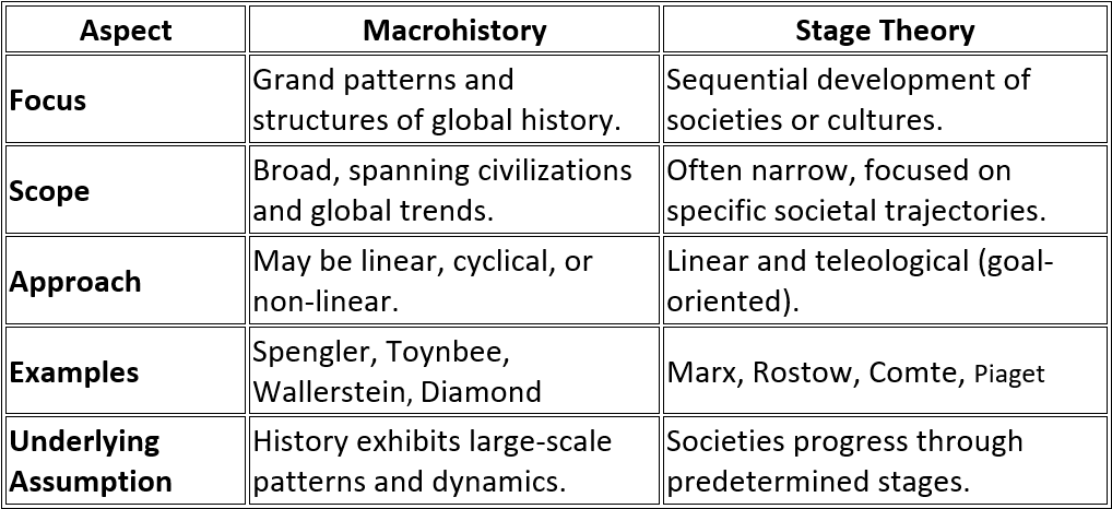 La macrohistoire et la théorie des étapes sont distinctes, mais elles s'intéressent