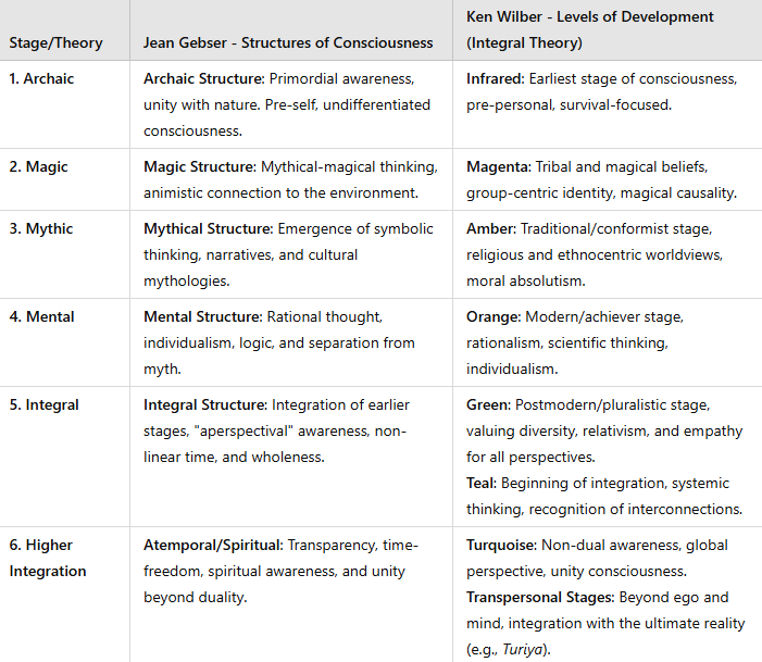 Dans la seconde moitié du XXe siècle, les philosophes Jean Gebser et Ken Wilber ont étendu les théories des stades à la conscience humaine. Gebser a décrit la progression de l'humanité à travers des «structures» de conscience distinctes : les stades archaïque, magique, mythique, mental et intégral.