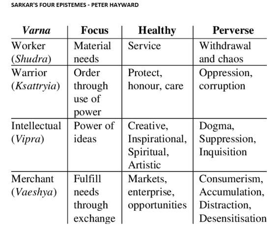 Sarkar a souligné que les quatre varnas sont nécessaires au bon fonctionnement de la société. Comme nous l'avons vu dans l'histoire récente, lorsqu'un ou plusieurs des quatre varnas sont mis de côté, les sociétés perdent leur équilibre et leur vitalité. Le communisme a échoué parce qu'il a mis à l'écart les marchands, et le capitalisme échoue parce qu'il met à l'écart le travailleur.
